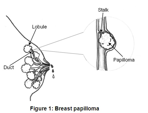 A papilloma attaches to the lining of a breast duct by a stalk. Papillomas that are large enough can block the duct.